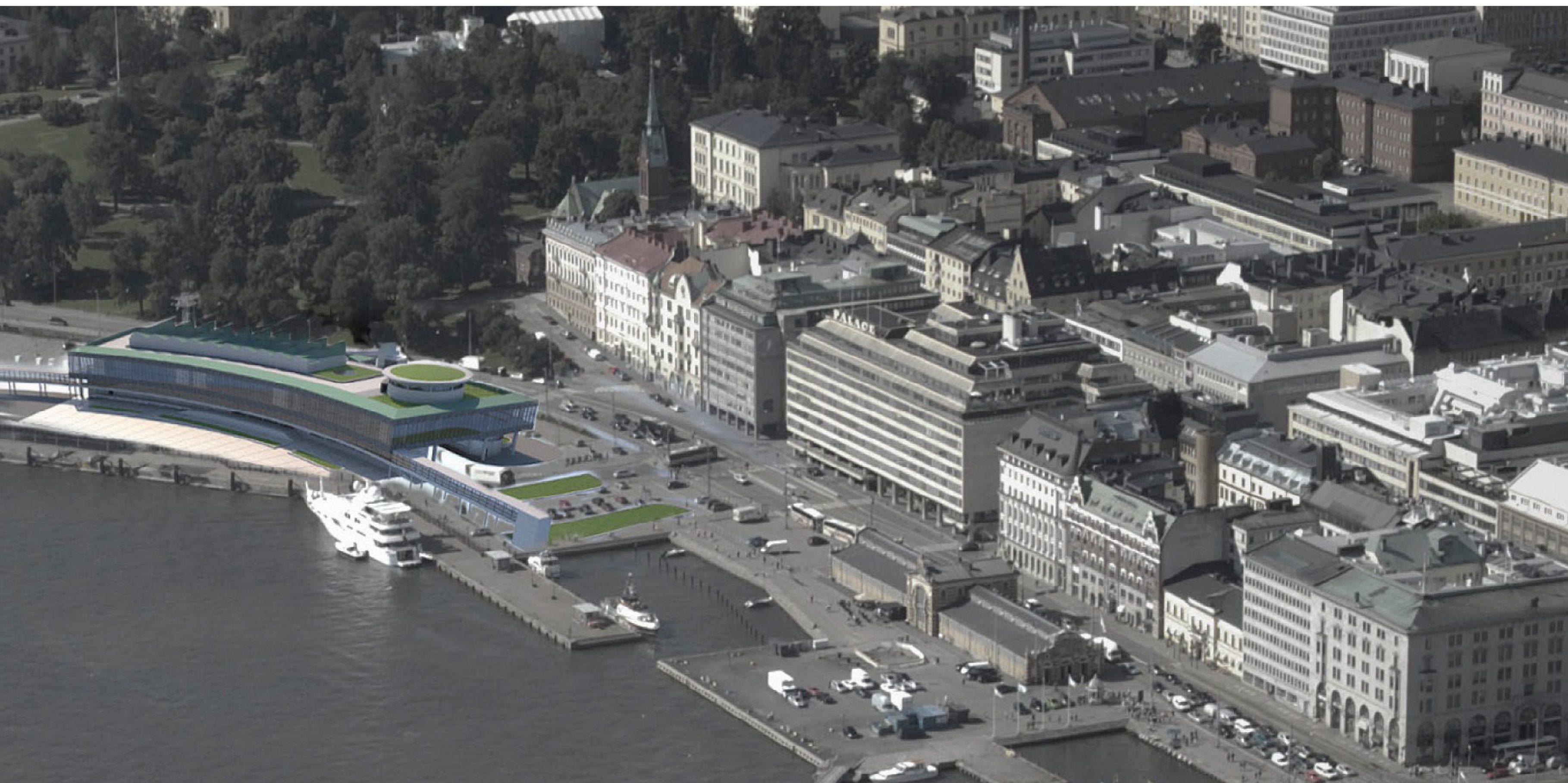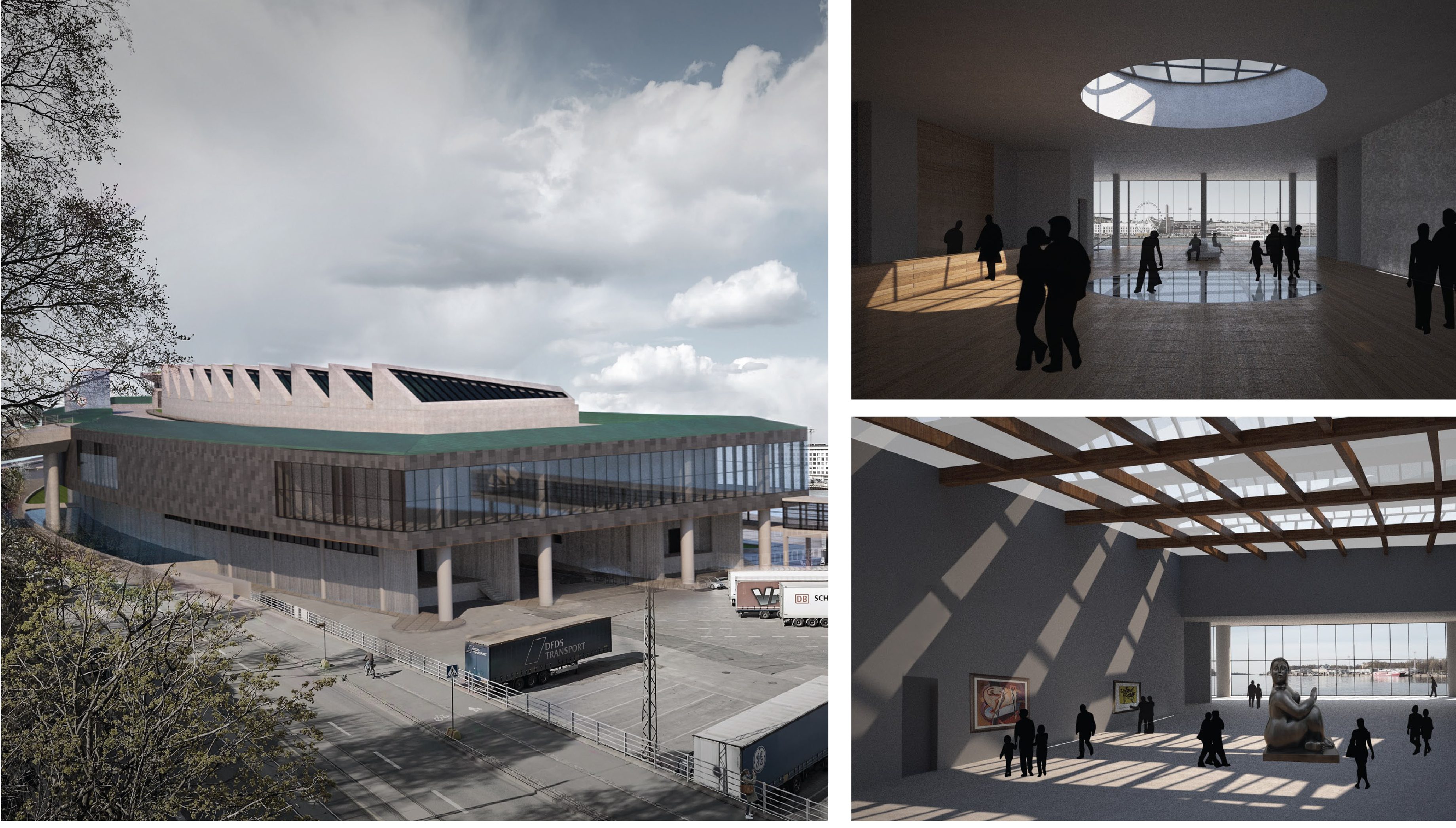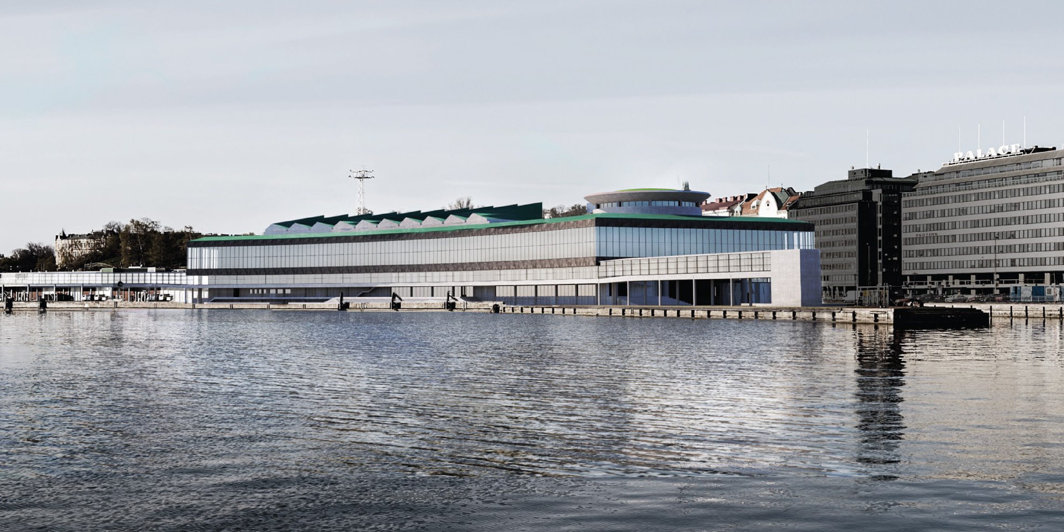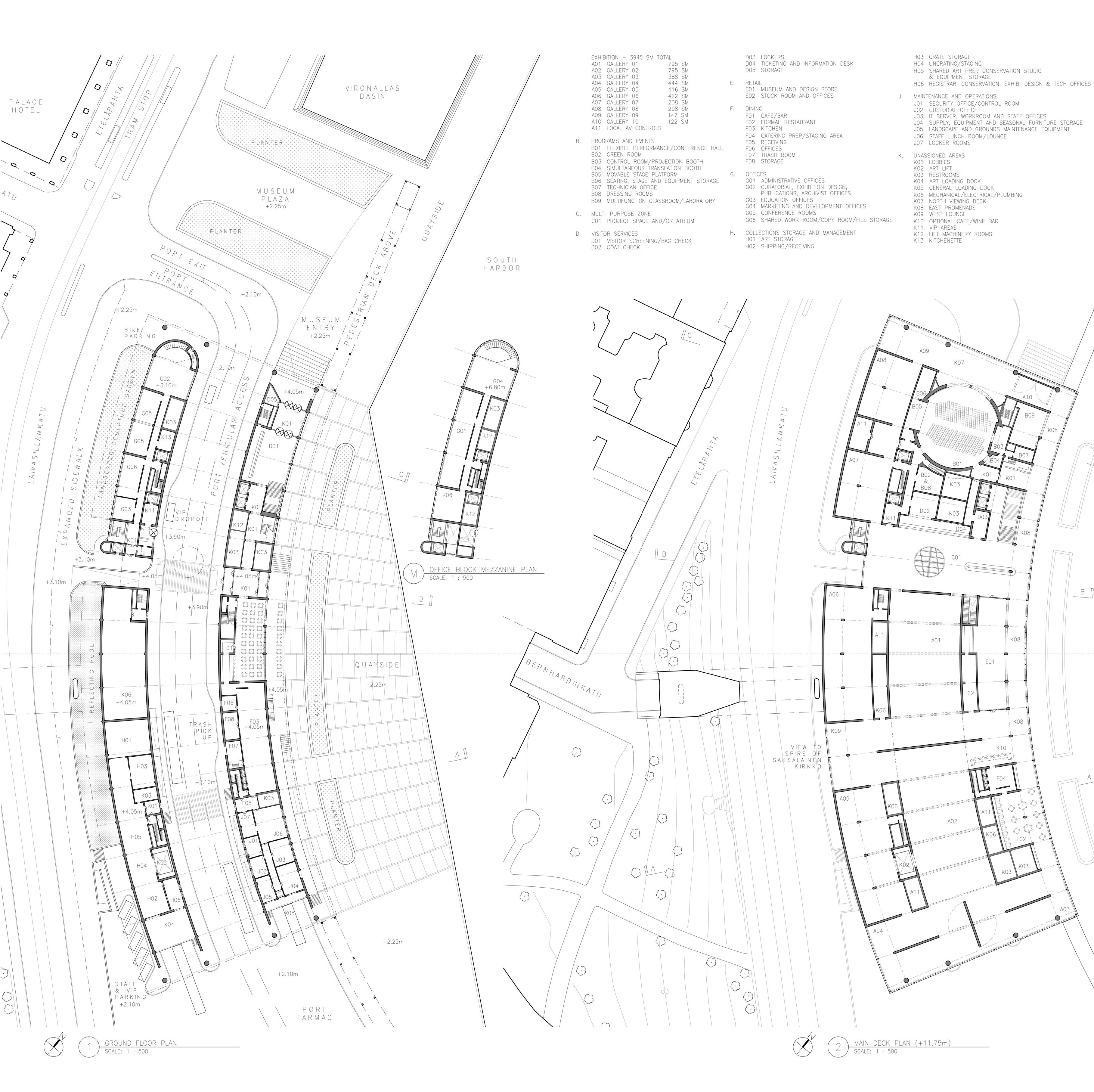 The blocks, street and deck are all gently curved to follow Laivasillankatu boulevard. The east edge of this deck forms a promenade above the quayside with a view across the South Harbor. Ten sail-like skylights and a green-roofed dome peak up through the roof, offering visual interest from afar. In its horizontality and simplicity, the proposal evokes the surrounding industrial warehouse and terminal architecture of the South Harbor.