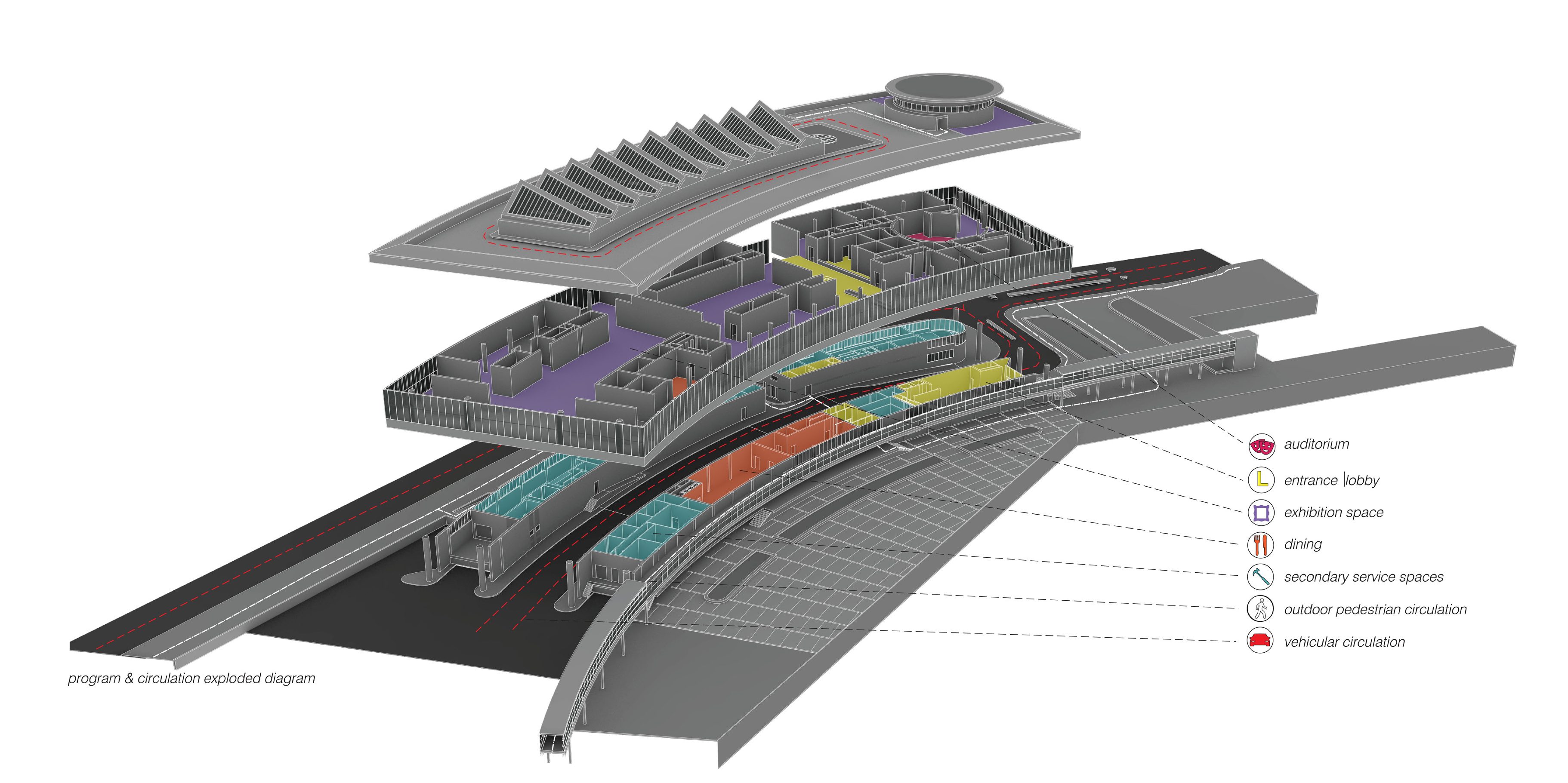 Through a seamless integration with adjacent infrastructure, the Helsinki Guggenheim museum is conceived not as an object, but as an outgrowth of its surroundings. Our proposal organizes most of the public components on a large raised deck, spanning over two long, parallel blocks on either side of a covered street leading to the port. Moving the port access to the space between the parallel blocks reduces the traffic next to the planned expanded sidewalk along Laivasillankatu boulevard, thus creating a more pleasant pedestrian experience.