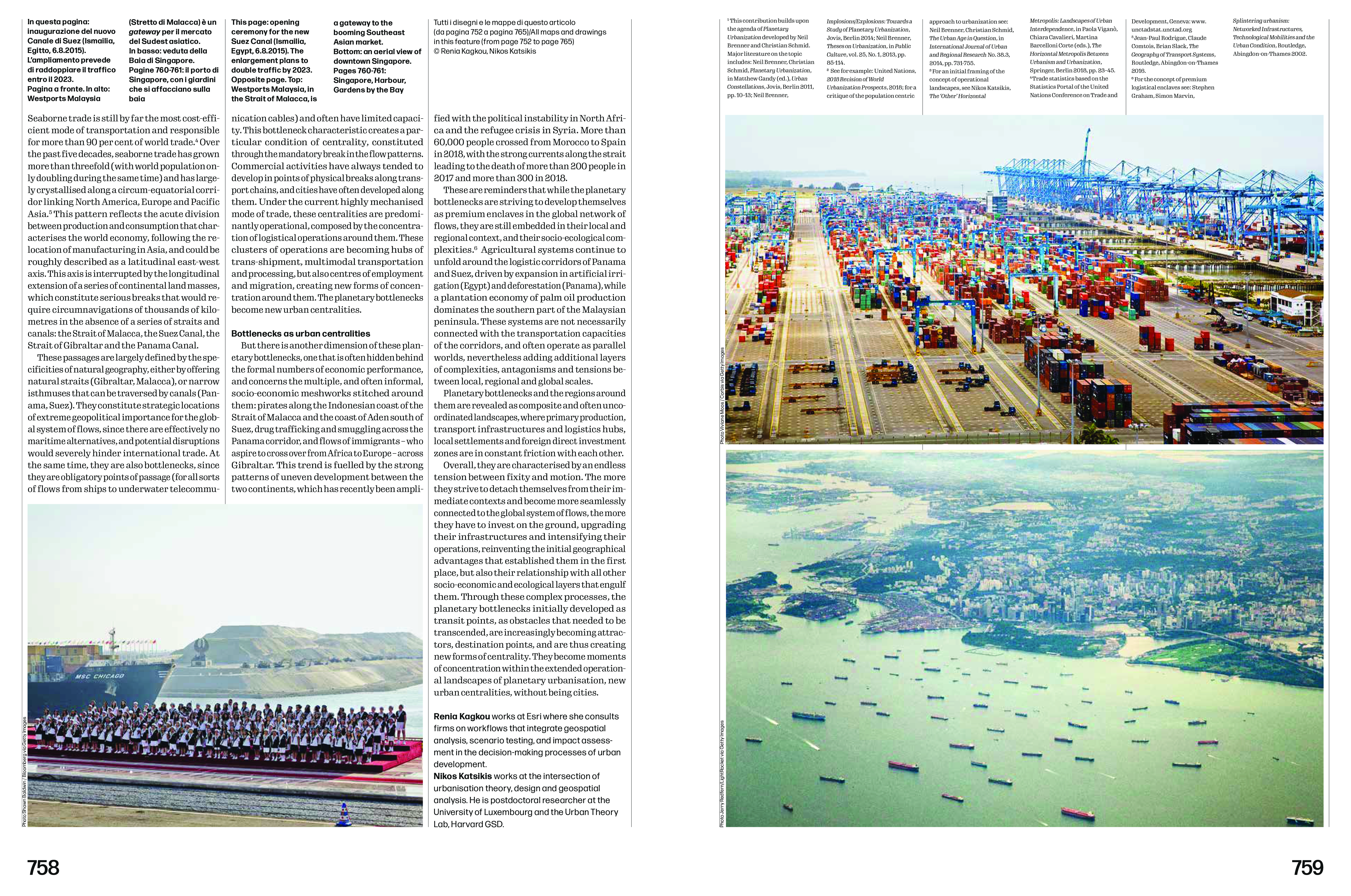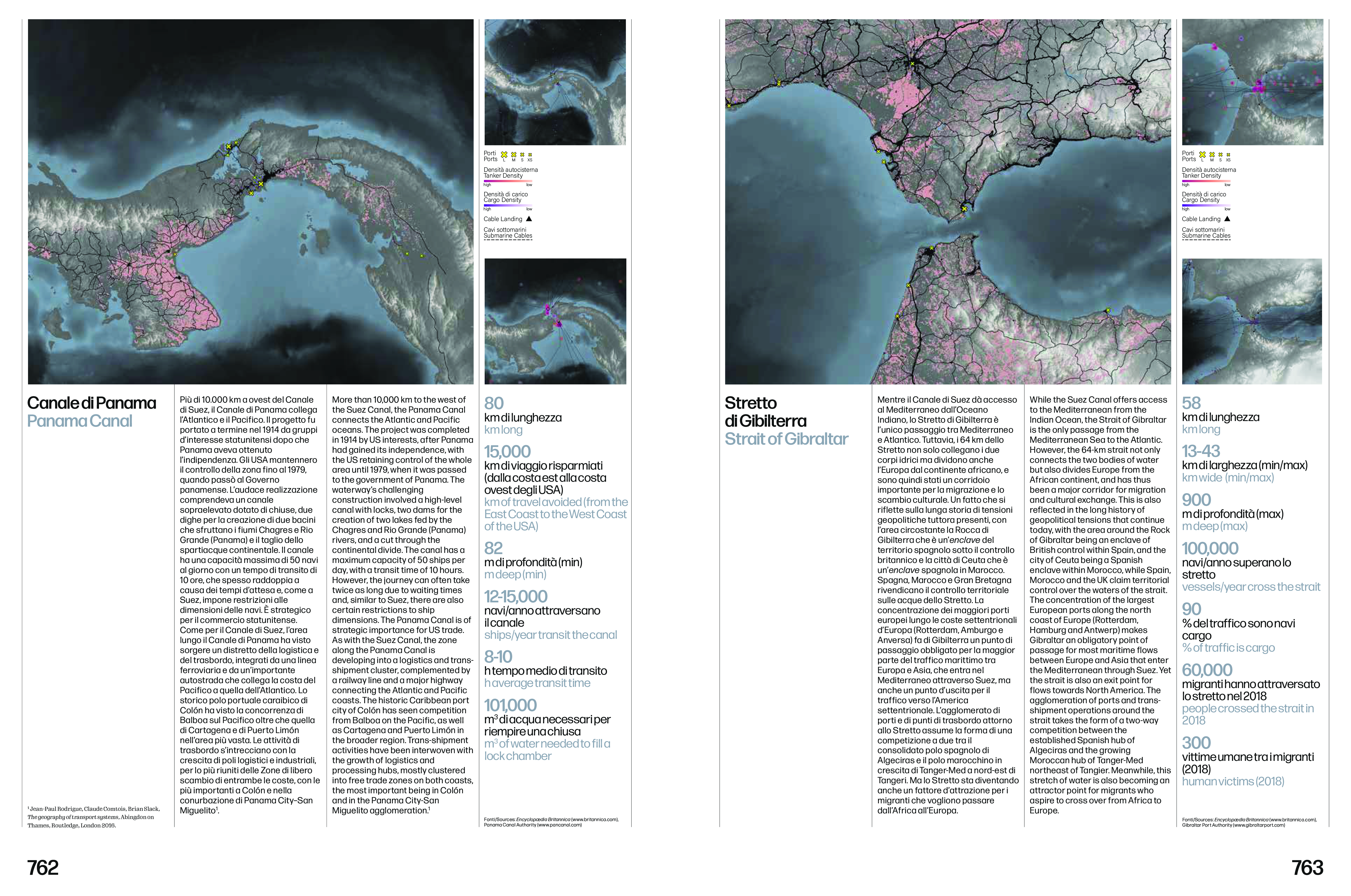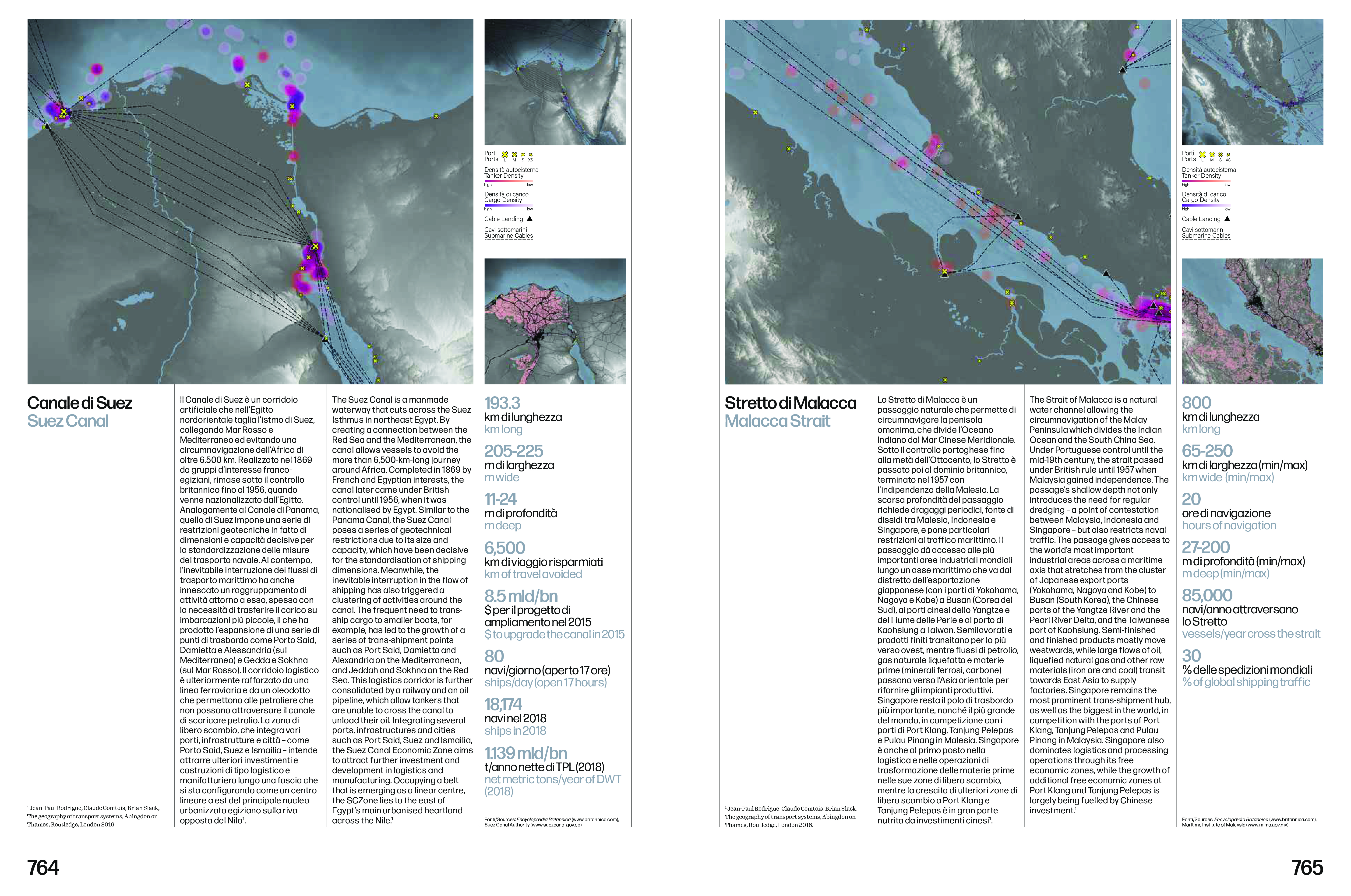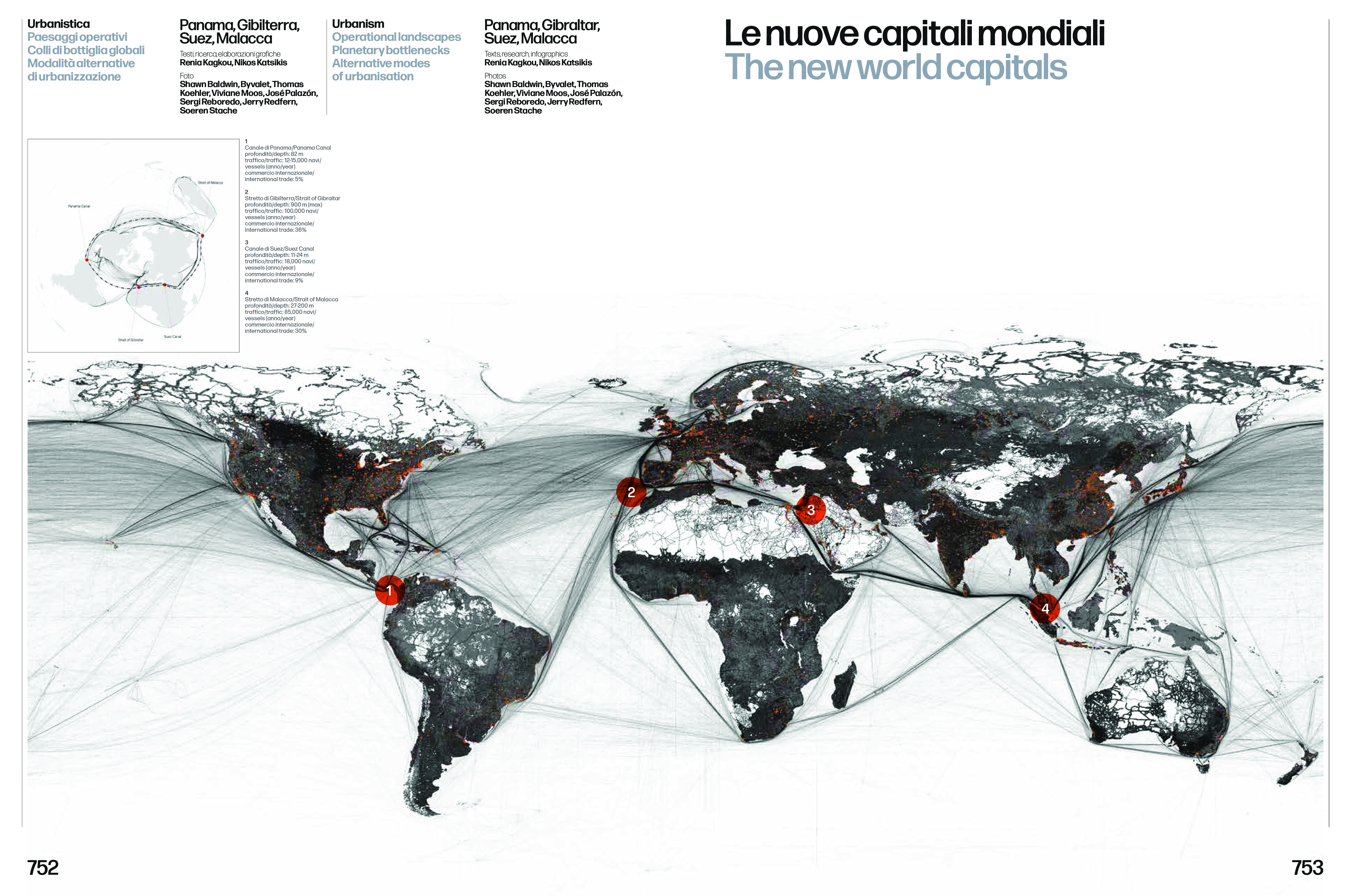 Within this context, certain operational landscapes become crystalized as strategic points in the planetary geography of urbanization. One exemplary case is the system of maritime passages located along the major maritime trade corridors, which accommodate more than 90% of global trade. Over the past decades, the major transoceanic routes have largely crystallized along a circum-equatorial corridor, linking North America, Europe and Pacific Asia. This latitudinal axis is interrupted by the longitudinal extension of a series of continental land masses, that would require circumnavigations of thousands of kilometers in the absence of a system of major straits and canals: the Malacca strait, the Suez canal, the Gibraltar strait, and the Panama canal. These passages constitute strategic points of extreme geopolitical importance for the global system of flows, since there are no effective alternatives. At the same time, they are also bottlenecks, since they are obligatory points of passage for all sorts of flows (from ships, to underwater telecommunication cables) and have often limited capacity. This bottleneck characteristic, creates a particular condition of centrality, creating around them clusters of operations and turning them into hubs of transshipment, multimodal transportation, and processing.